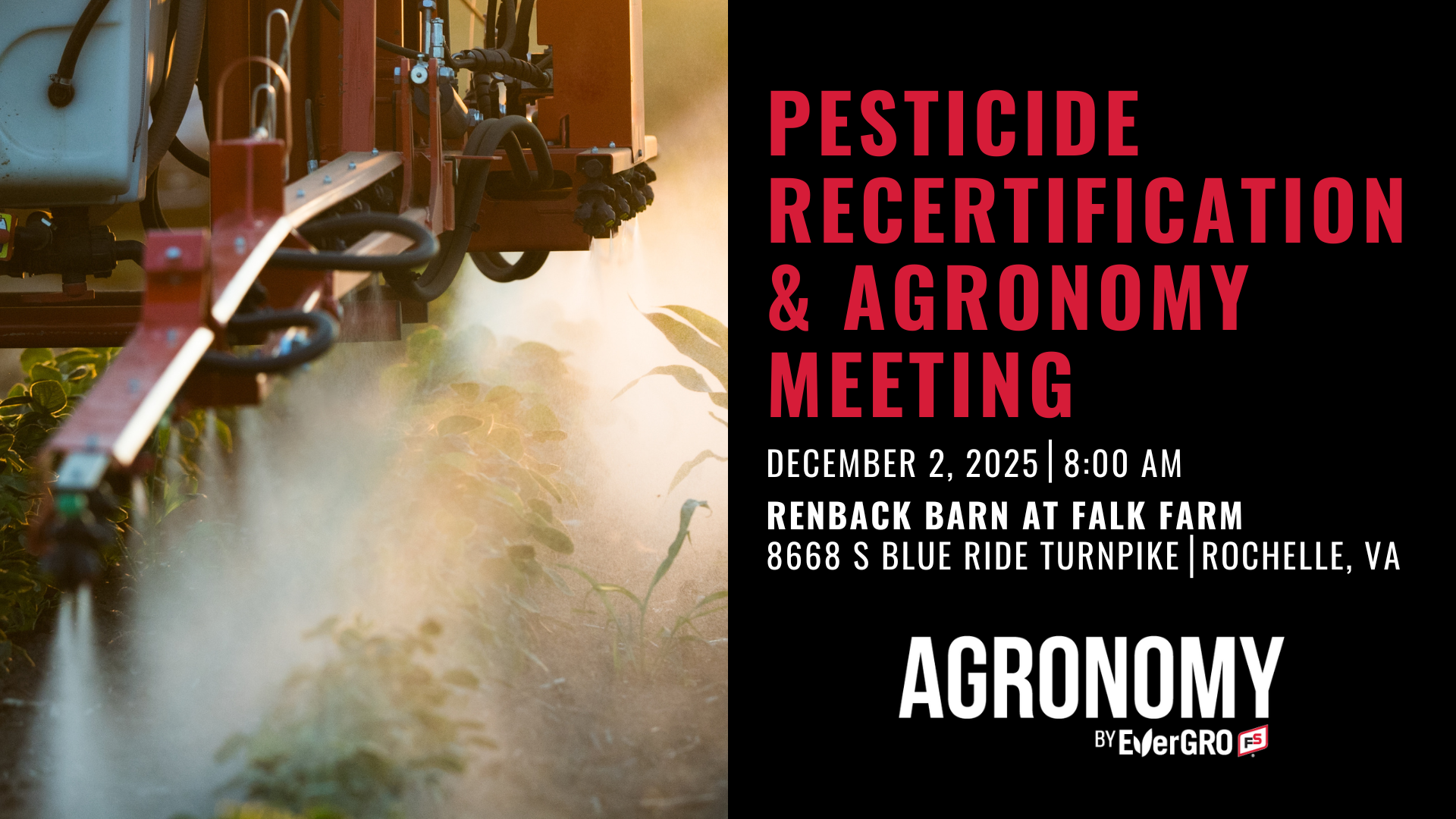 Renback Barn at Falk Farm 8668 South Blue Ridge Turnpike, Rochelle, VA, United StatesJoin Agronomy By EverGRO FS for our 2025 Pesticide Recertification & Agronomy Meeting on Tuesday, December 2 at Renback Barn (8668 S Blue Ridge Turnpike, Rochelle, VA 22738). This event will offer renewal for commercial and private applicators. We will have product reviews and industry updates presented by industry-leading professionals. See below for a full...